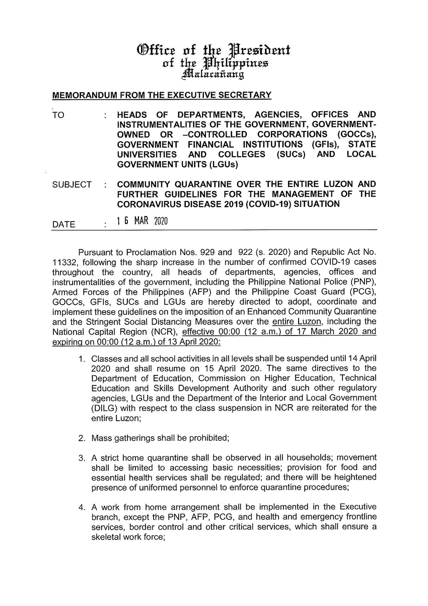 Community Quarantine Over the Entire Luzon and Further Guidelines for the Management of the Coronavirus Disease 2019 (COVID-19) Situation