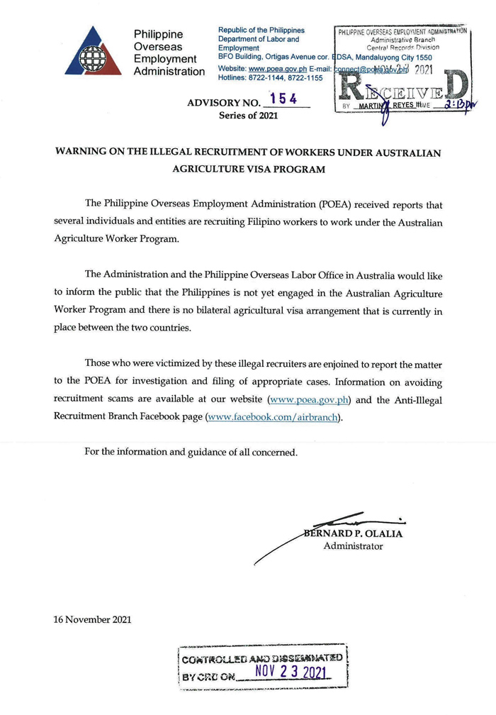 Warning on the Illegal Recruitment of Workers under Australian Agriculture Visa Program